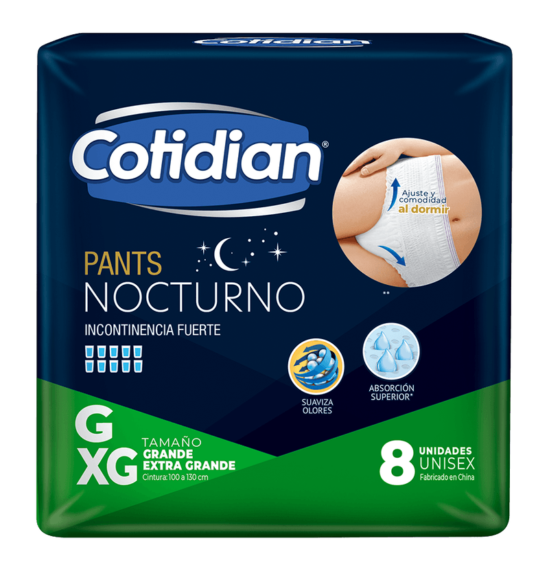 Ropa interior desechable para incontinencia fuerte. Cotidian Pants Nocturno brinda ajuste y comodidad al dormir, diseño similar a la ropa interior, tiene absorción superior, cubierta exterior tipo tela, cintura elástica, barreras antidesbordes y suaviza olores.