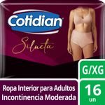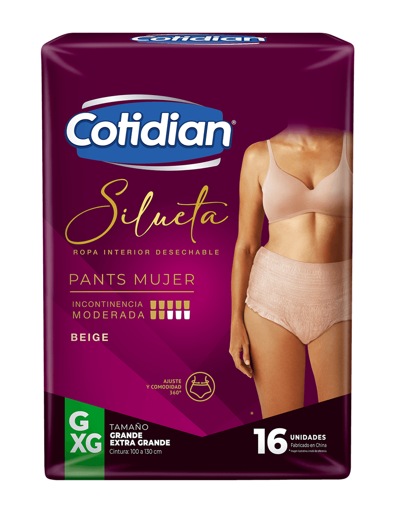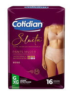 Ropa interior desechable para incontinencia moderada. Cotidian Pants Silueta brinda ajuste y comodidad, diseño similar a la ropa interior, tiene absorción superior, cubierta exterior tipo tela, cintura elástica, barreras antidesbordes y suaviza olores.