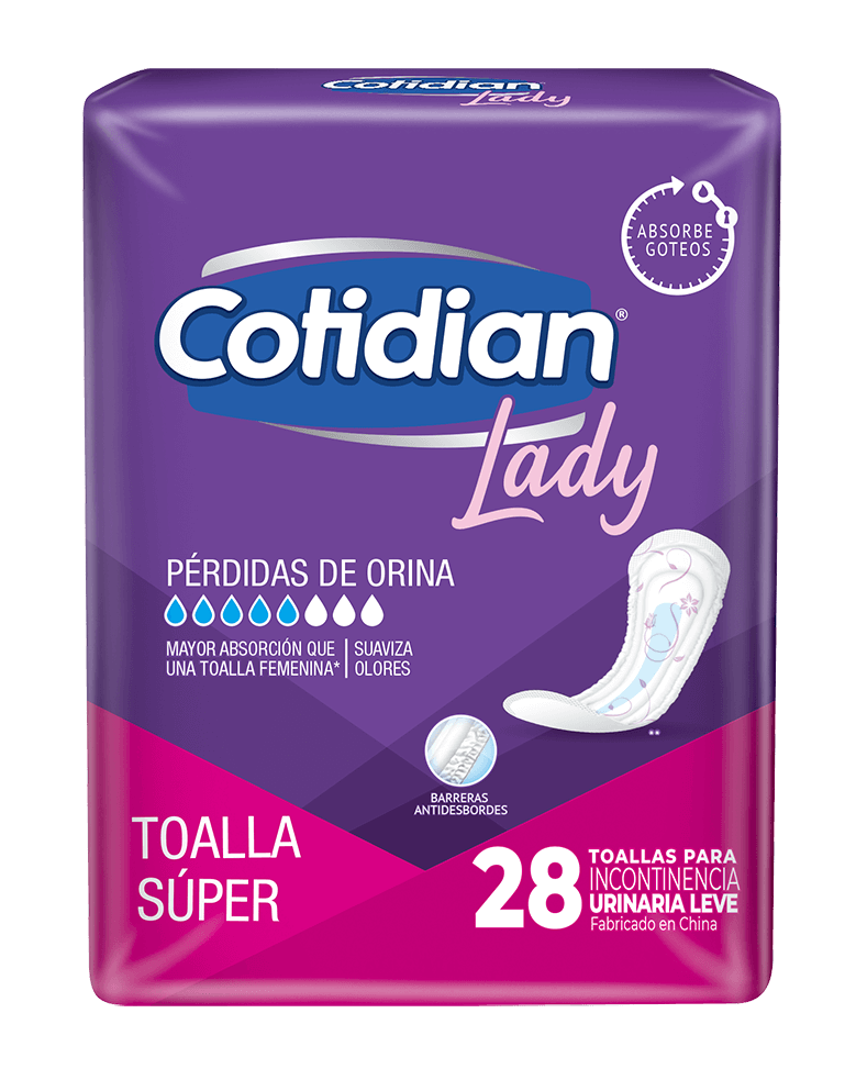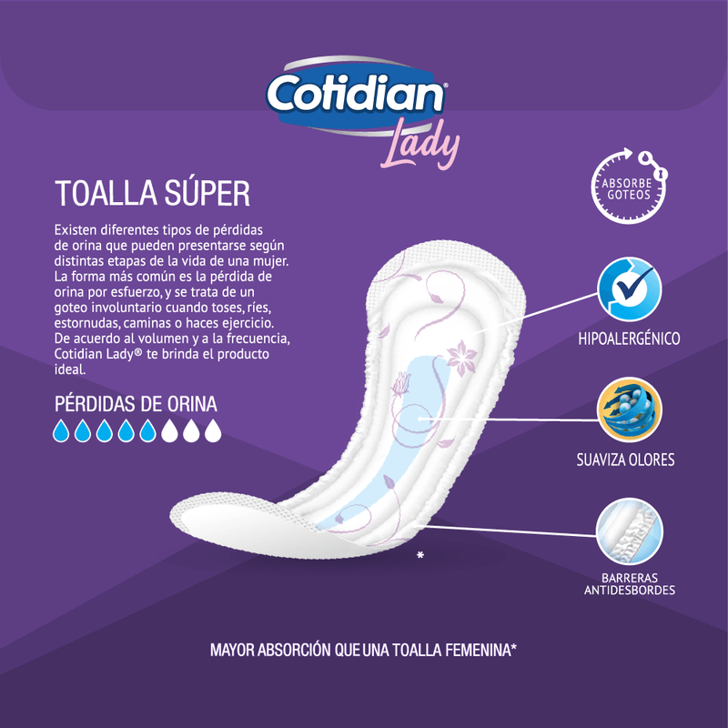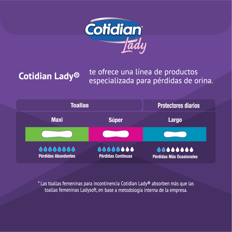 Toallas femeninas para pérdidas de orina leves. Con una nueva forma anatómica, núcleo de rápida absorción y control de olores. Cubierta interior y barreras antidesbordes extra suaves. Podrás sentirte segura y protegida todo el día. Sabías que nuestras Toallas Cotidian Lady absorben más que el promedio de la categoría de toallas femeninas de menstruación, esto en base a metodología interna de la empresa.
